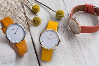 Mango Mojito-Gelb strahlt mit der Sonne um die Wette und wirkt mit einem goldfarbenen Gehäuse besonders trendig. Living Coral vereint sich mit zartem Roségold und kräftiges Kurkuma-Orange punktet mit seiner warmen Aura. Wer es eher pastellig mag, für den ist das sanfte Sweet Lilac der perfekte Begleiter. Die angesagten Farben der hochwertigen Lederarmbänder harmonieren wunderbar mit dem puren Look der Uhren.