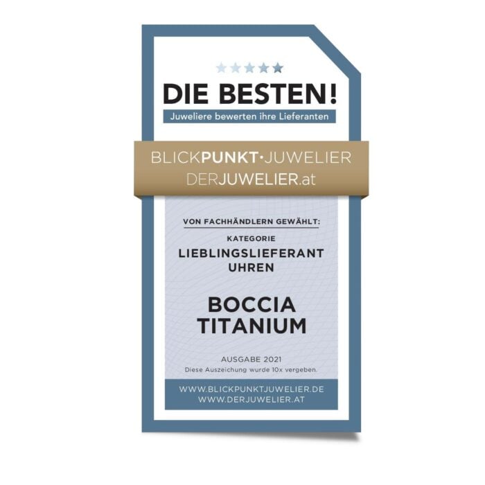 Wir von Boccia Titanium freuen uns sehr darüber, dieses Jahr sogar gleich in drei Kategorien gewonnen und die meisten Stimmen hunderter befragter Juweliere erhalten zu haben. Neben den Top-Platzierungen als „Fachhandelsmarke Uhren“, „Konstanter Uhrenpartner 2020“ und „Lieblingslieferant-Uhren“, gab es zusätzlich die Auszeichnung der sogenannten „Königs-Kategorie“ als „Lieblingslieferant“.