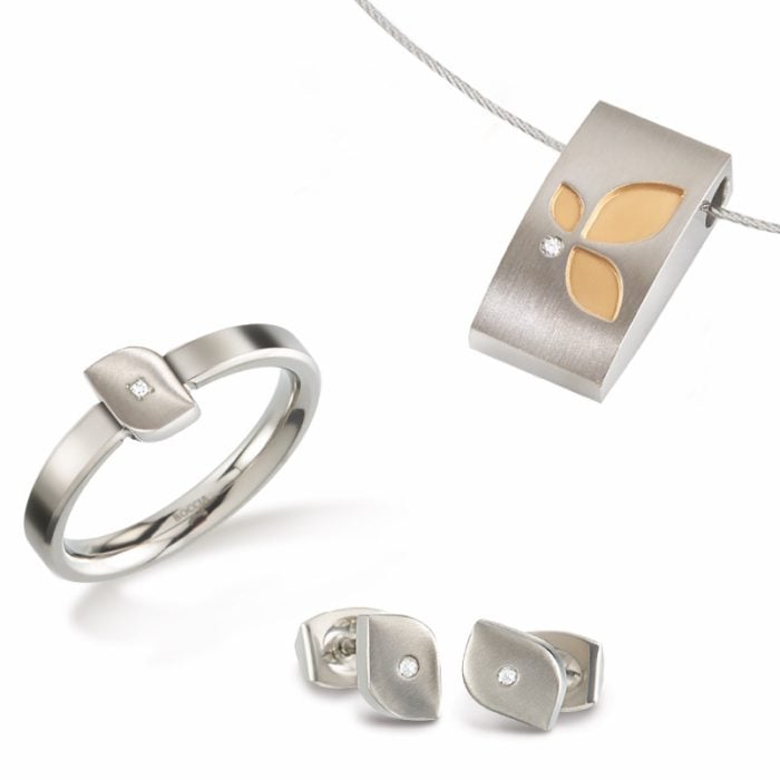 Floral elements like blossoms and leaves stretch heavenward and spark desire for this new line in the BOCCIA TITANIUM collection. Pure titanium plays appealingly with matte grey and high-gloss polished surfaces. Pretty gold plating in warm nuances creates fashionable bicolour effects. Little diamonds sparkle as a central highlight in the midst of the tulip or as a trio like three dazzling dewdrops in the early morning sunlight.